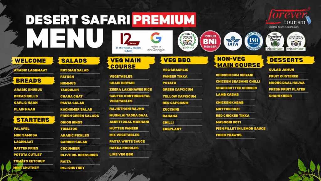 As dusk settles, arrive at a traditional Bedouin-style camp—a highlight of the evening. You’ll be welcomed with Arabic coffee and dates before settling into a night of authentic experiences. Enjoy a hearty BBQ dinner, featuring both vegetarian and non-vegetarian options, or upgrade to a VIP dinner-focused package for enhanced comfort and premium menu selections. Live performances—including belly dance, Tanoura, Khaliji shows, and fire displays—set the perfect rhythm for a magical desert evening.